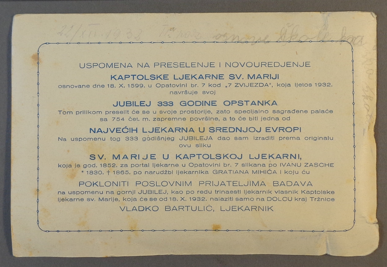 Sveta sličica; Sveta obitelj i dijete Ivan Krstitelj; Uspomena na preselenje i novouredjenje kaptolske ljekarne Sv. Mariji