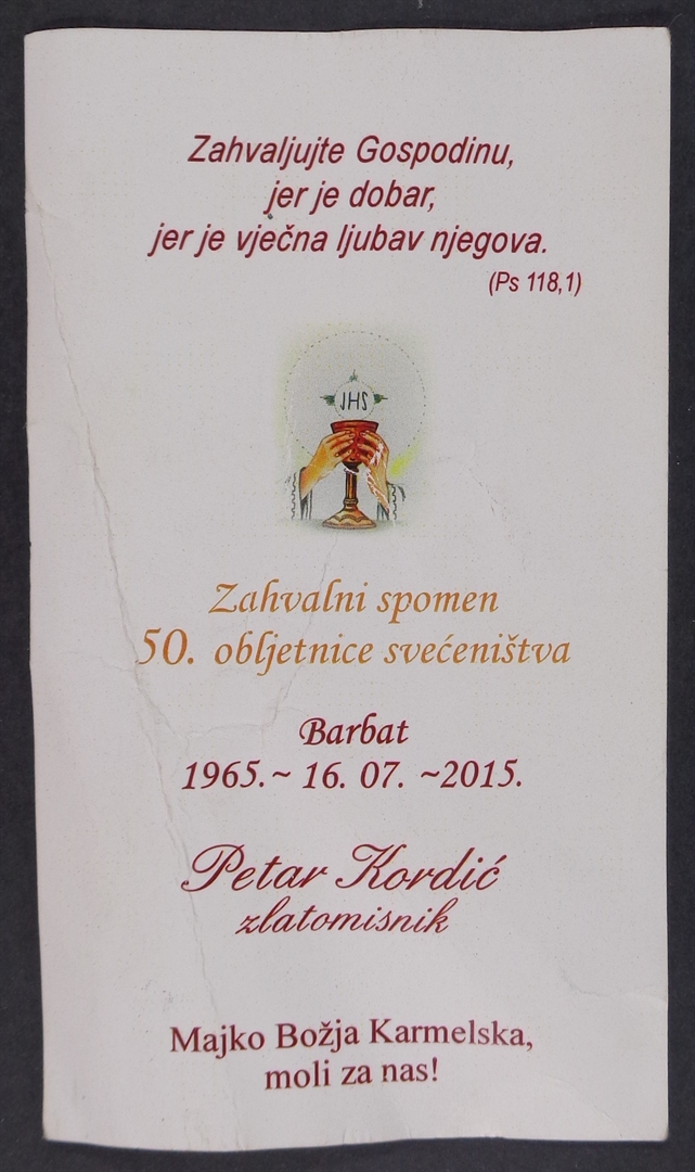 Sveta sličica; Majka Božja karmelska i Dijete sa škapularima; Zahvalni spomen 50. obljetnice svećeništva